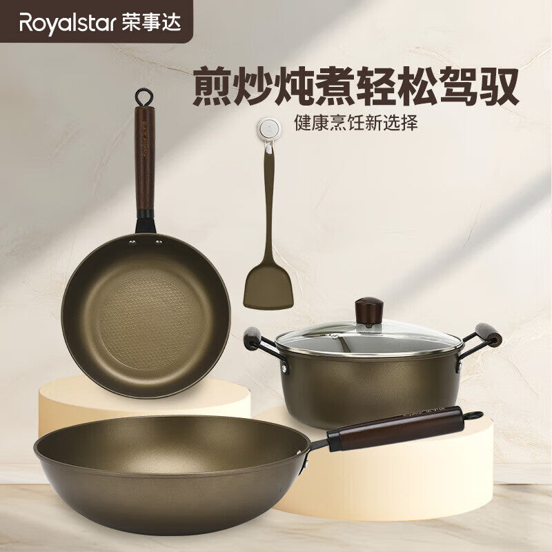 Fashion four-piece set for frying, stir-frying and soup making, non-stick (wok, frying pan, soup pot, silicone spatula)